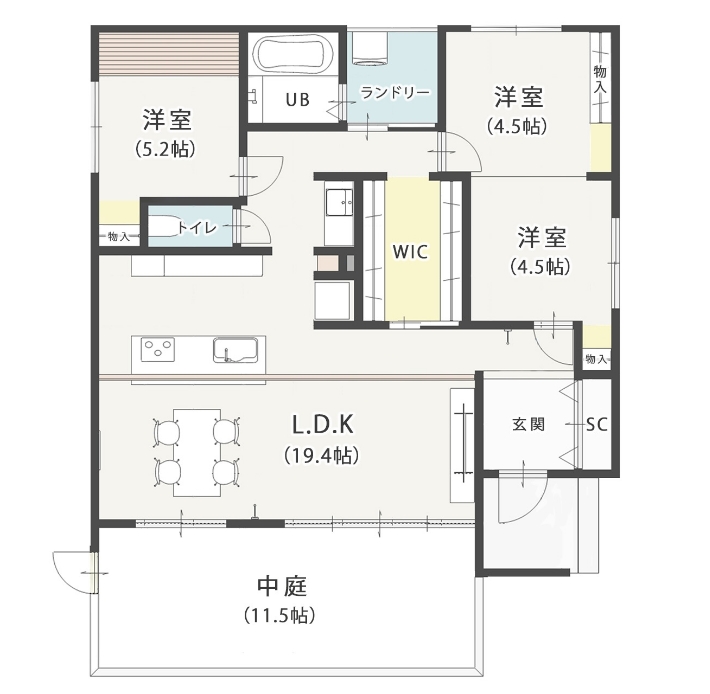 平屋 3LDK+WIC+中庭