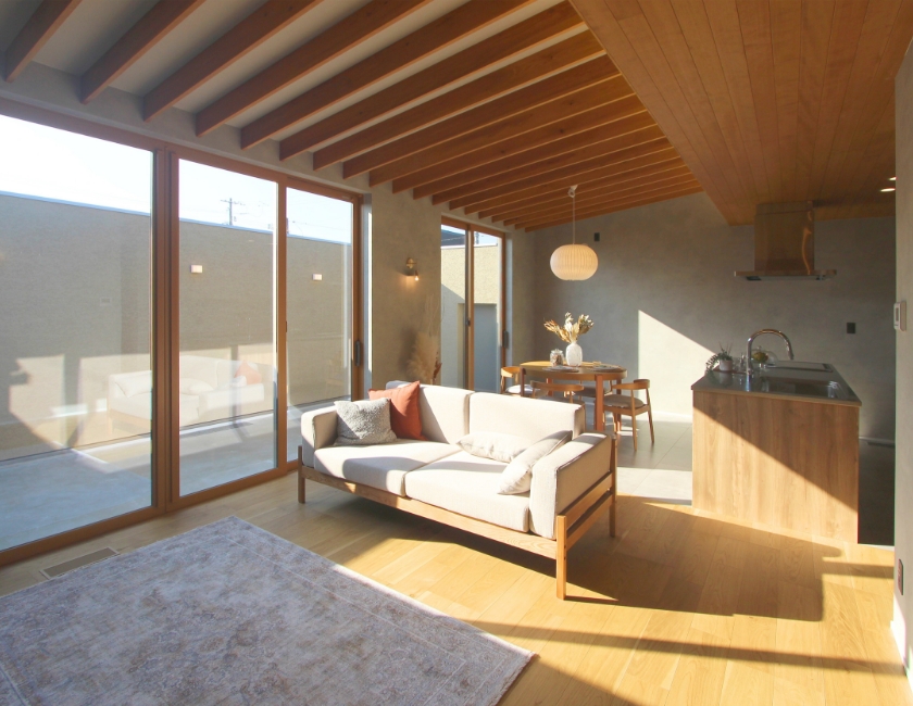 階段のないフラットな暮らしで、子育ても日常もスムーズに! LDKと中庭が一体となり、平屋ならではの開放感を楽しめます。